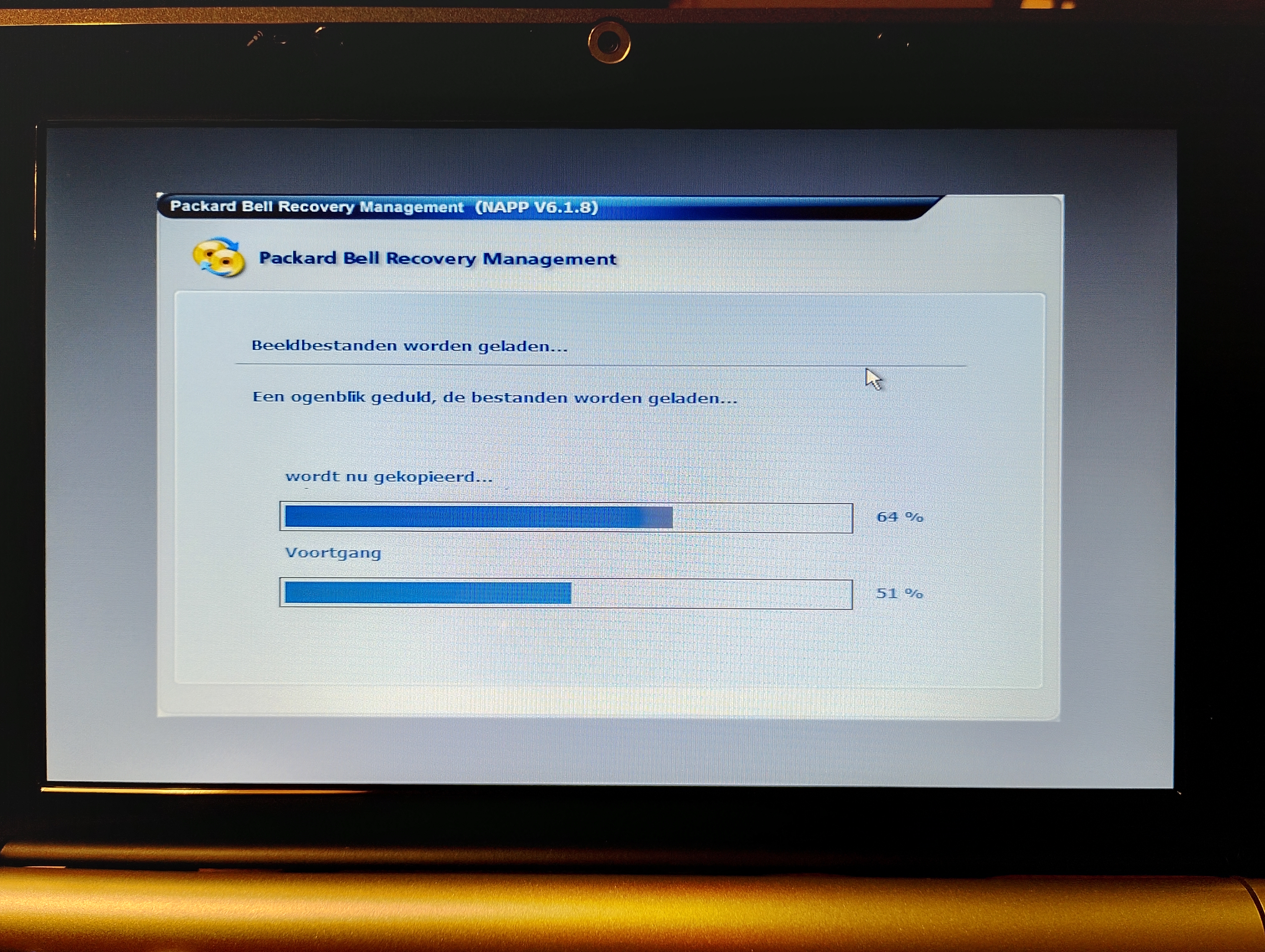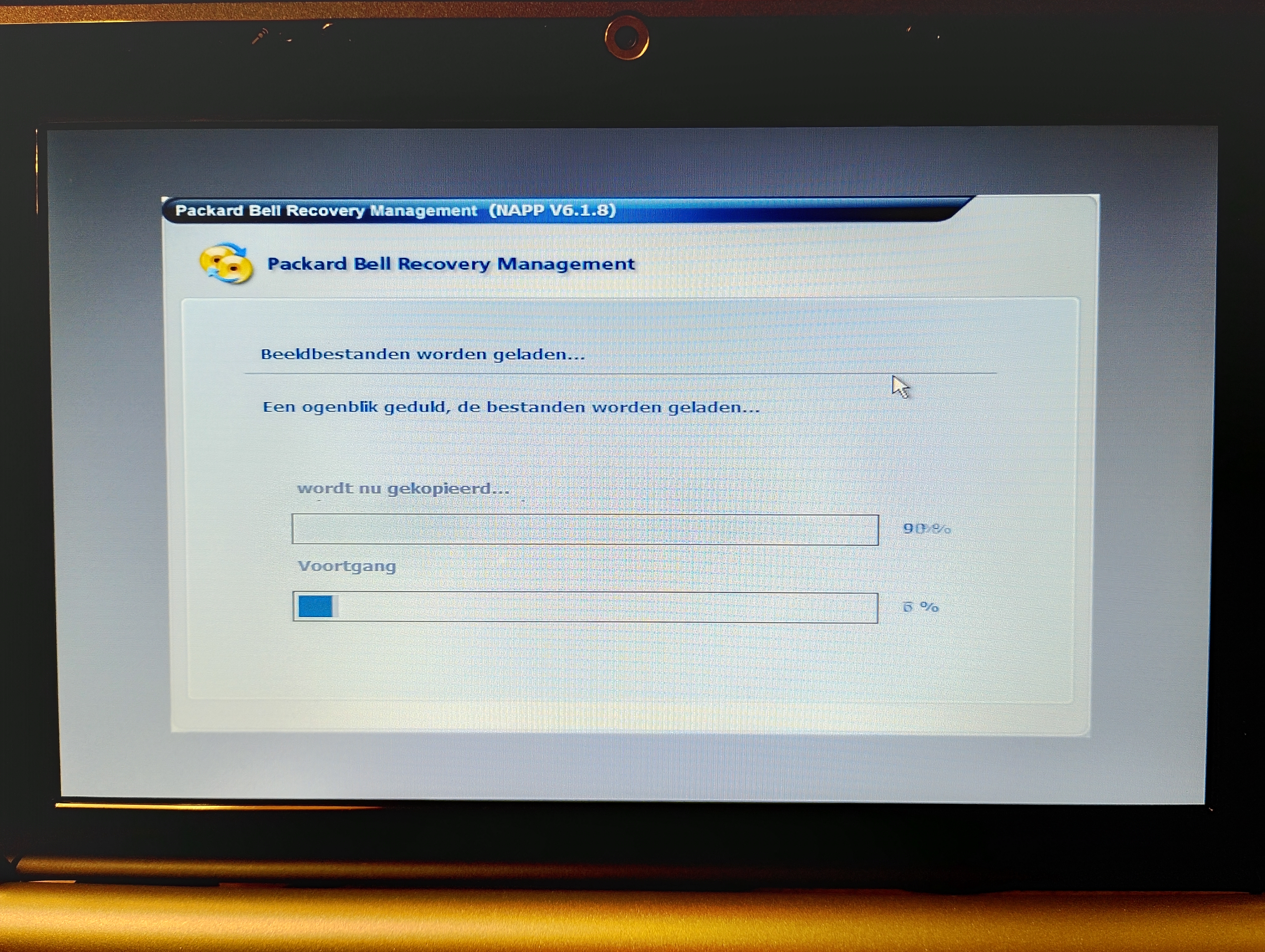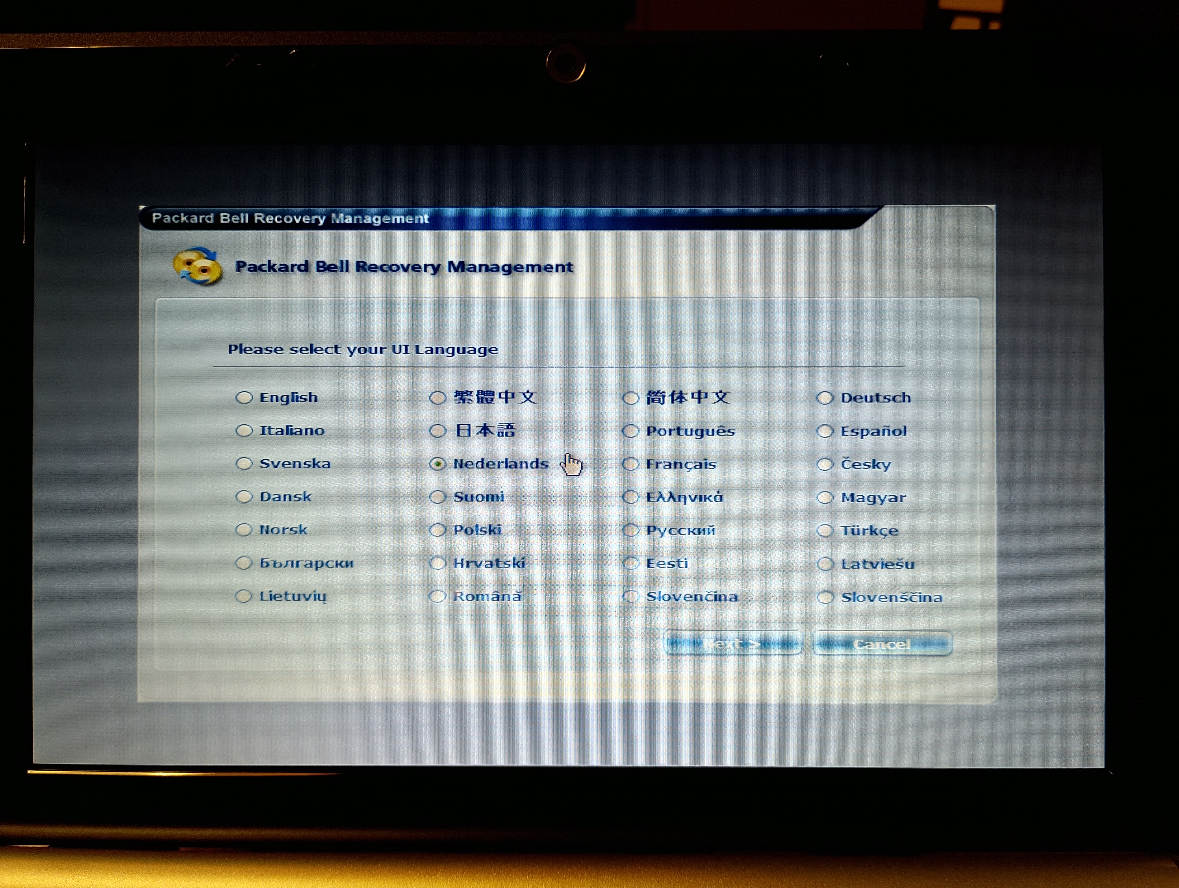 geladen. Na enige tijd verschijnt het Packard Bell Recovery Management-scherm